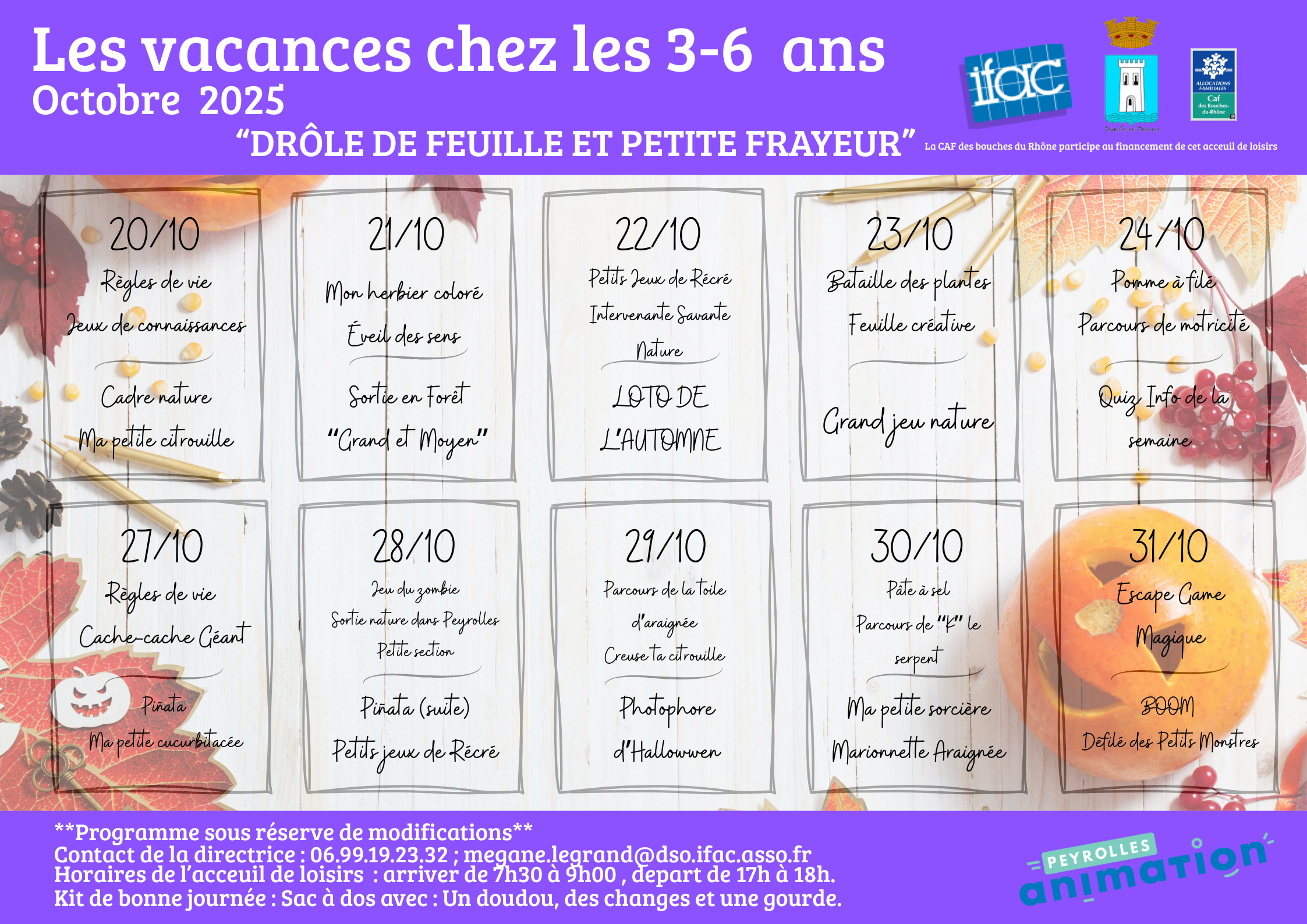 Accueil > Actualités > Programmes 3/5 ans_Vacances OCT25 Programmes 3/5 ans_Vacances OCT25 Planning Découvrez ce qui attend vos enfants pendant les prochaines vacances ! Téléchargez nos programmes Programme Vacances Oct 3/5 ans