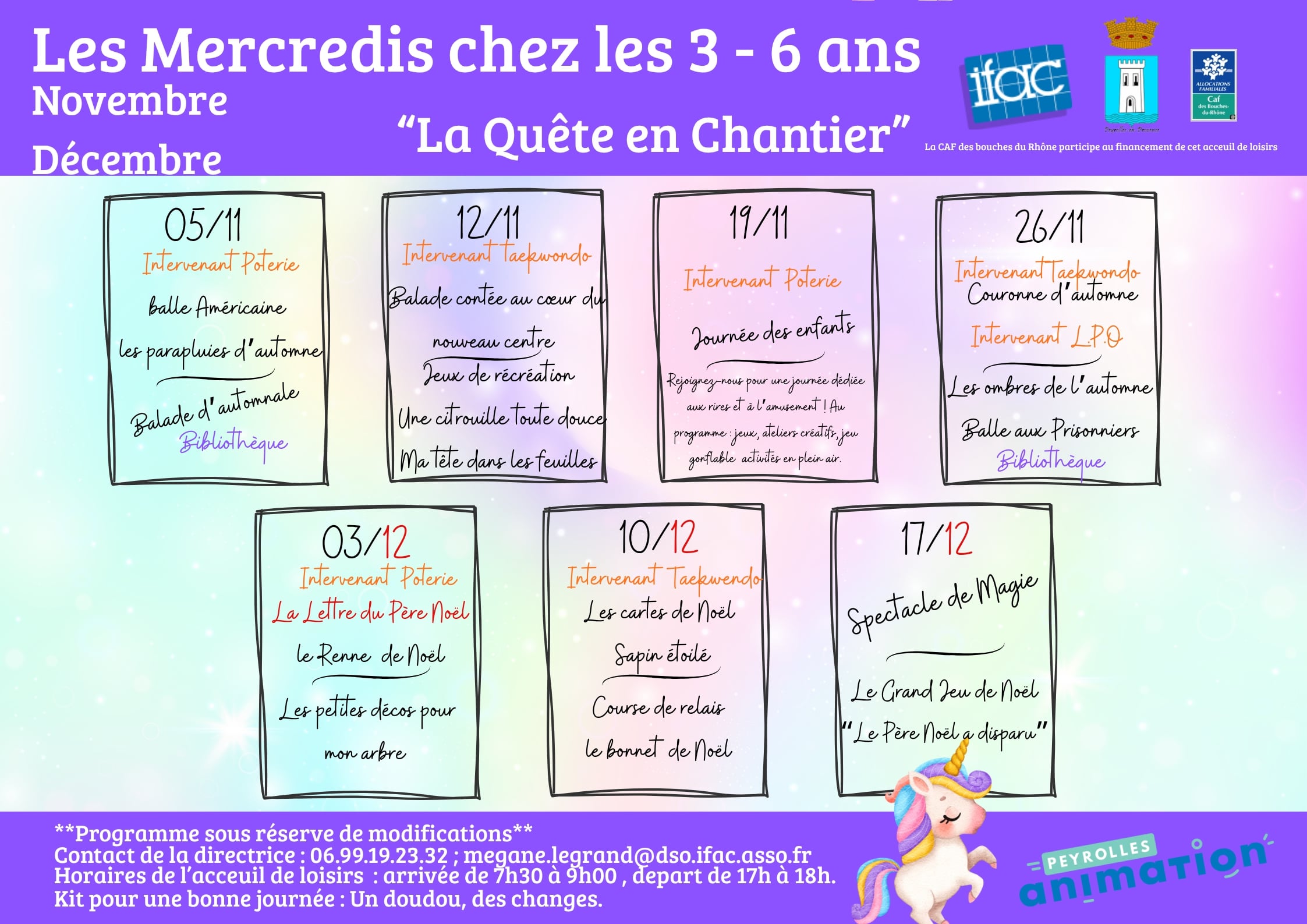 Accueil > Actualités > Programmes 3/5 ans_NOV DEC 25 Programmes 3/5 ans_NOV DEC 25 Planning Découvrez ce qui attend vos enfants pendant les prochains mercredis ! Téléchargez nos programmes Programme Mercredis 3/5 ans