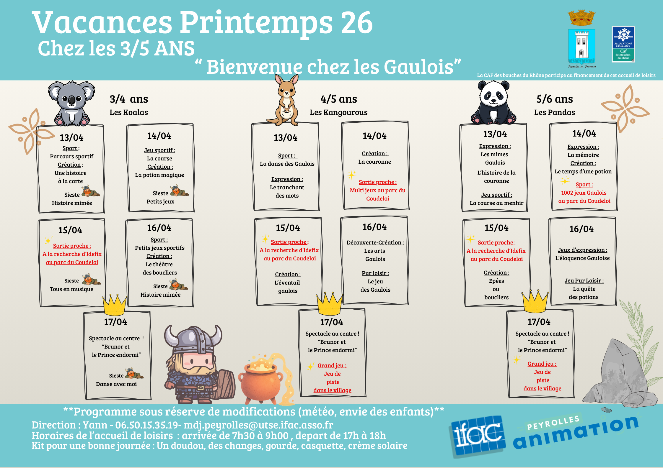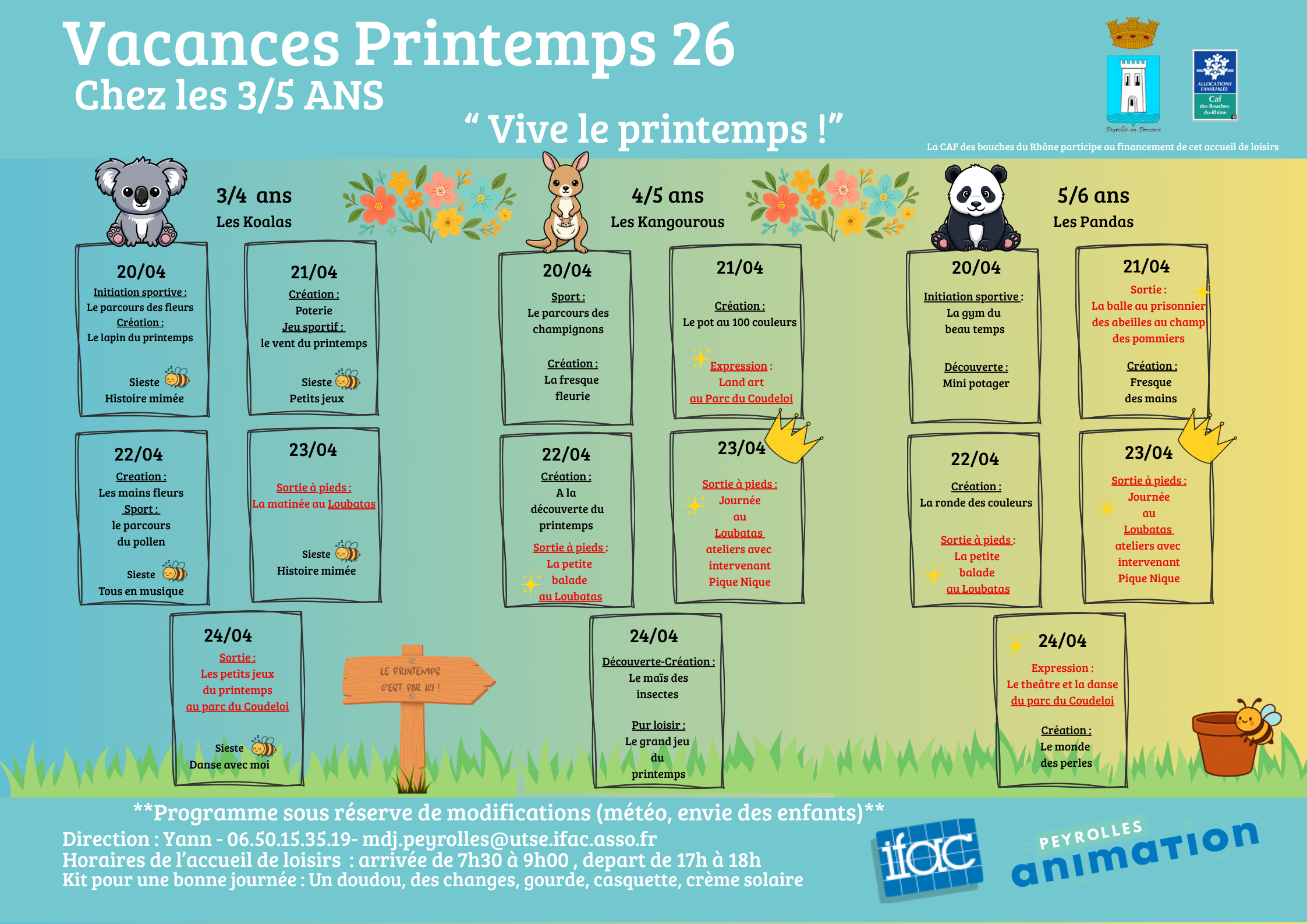 Accueil > Actualités > Programmes Vacances 3/5 ans AVRIL 26 Programmes Vacances 3/5 ans AVRIL 26 Événement Voici le planning des activités pour ces vacances ! Téléchargez nos programmes ! Semaine 1 Semaine 2