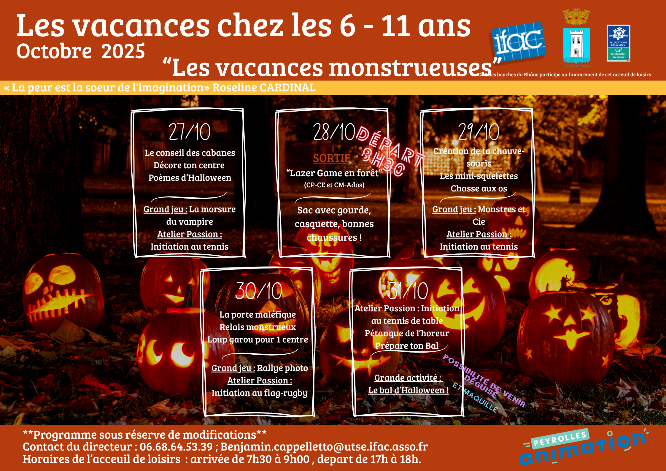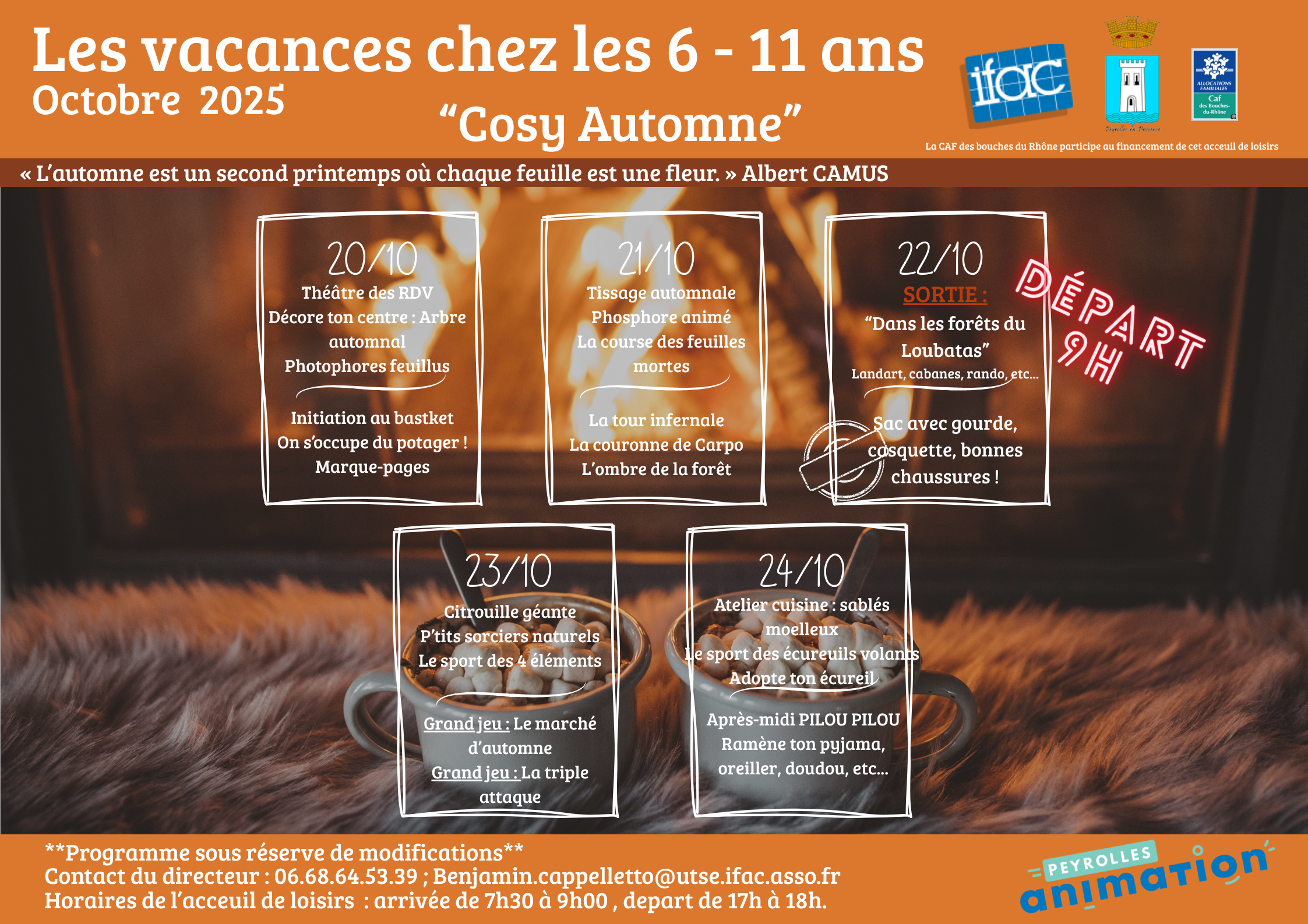 Accueil > Actualités > Programme 6/11 ans_Vacances Oct 25 Programme 6/11 ans_Vacances Oct 25 Planning Découvrez nos activités pour ces vacances d’automne ! Téléchargez nos programmes Semaine 1 Semaine 2
